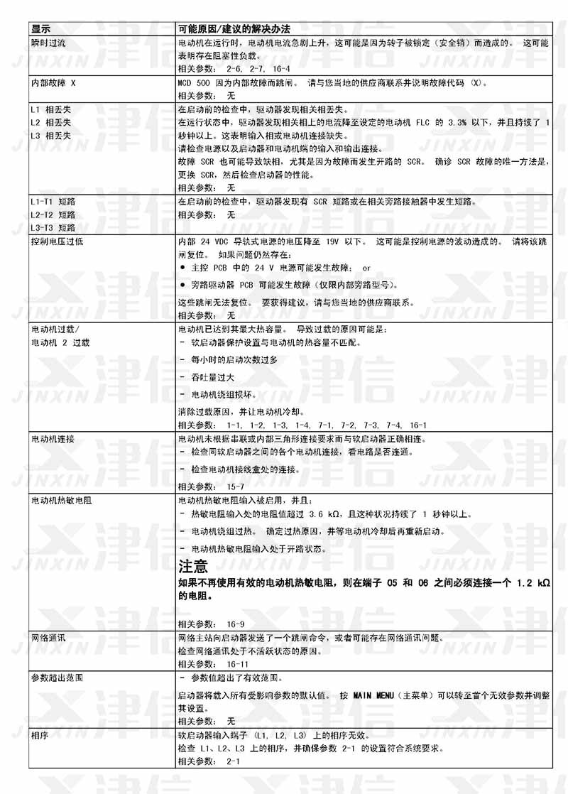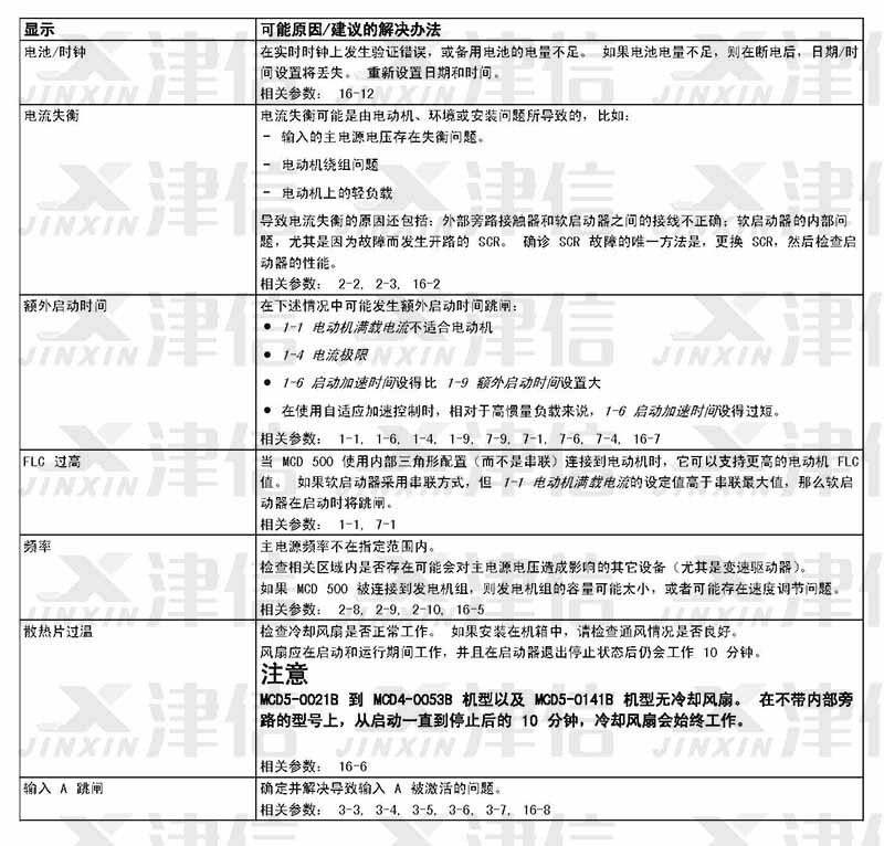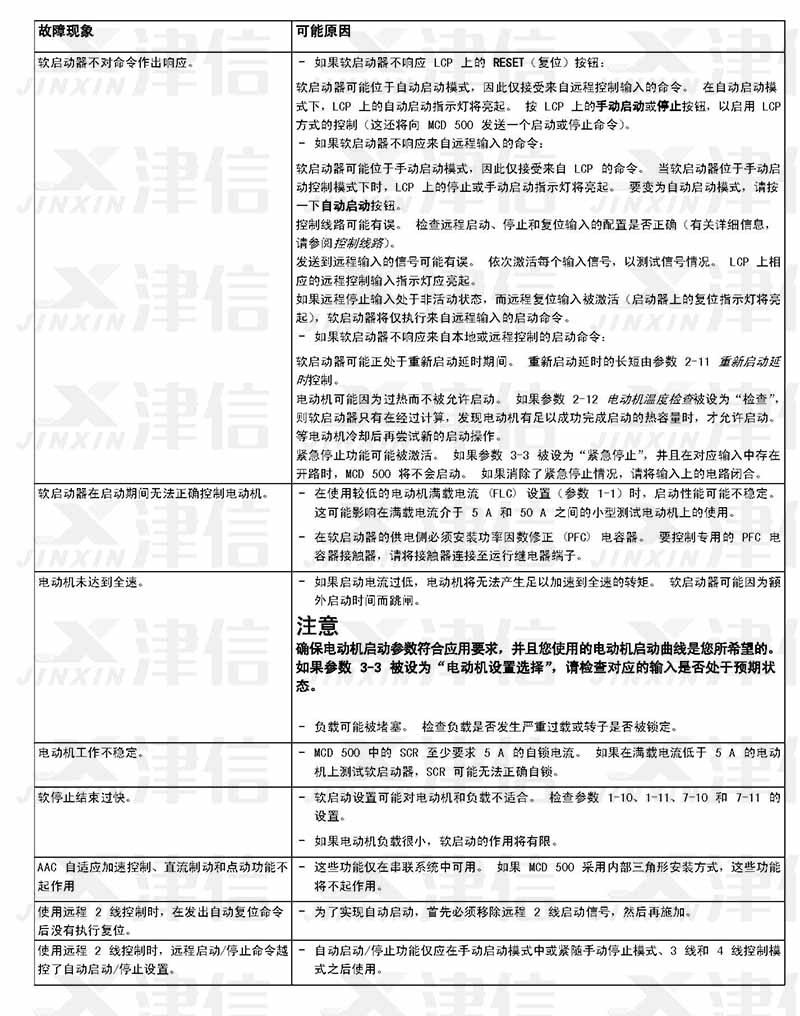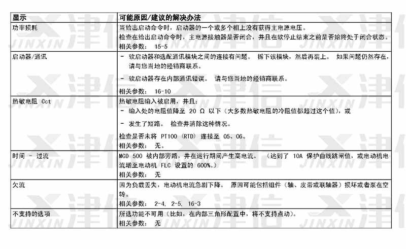 在軟啟動器使用過程中,如果偵測到故障信息,軟啟動器會在日志中記錄相關(guān)信息,還可能跳閘或發(fā)出警告。軟啟動器跳閘后,只有將該軟啟動器復(fù)位才能重新啟動。 如果發(fā)出警告,則一旦消除了警告原因,軟啟動器便會自動復(fù)位。