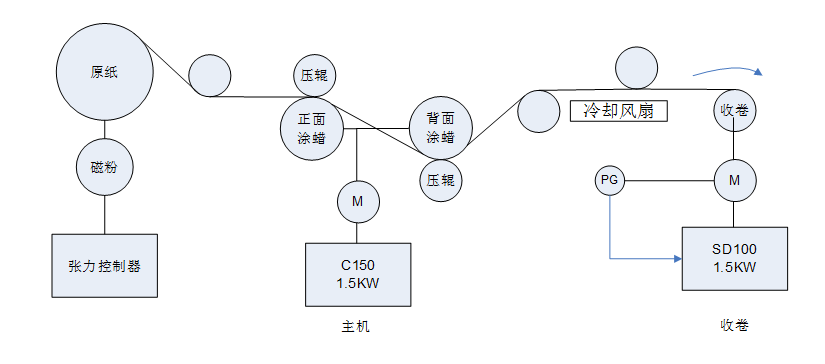 紙張涂蠟設備是將原紙兩面均勻地涂上液態蠟,再將涂蠟后的材料以中心卷取的方式收好。整機以涂蠟部位作為主機,收卷采用錐度張力收卷,整機速度在150-200 m/min運行。